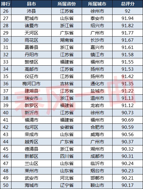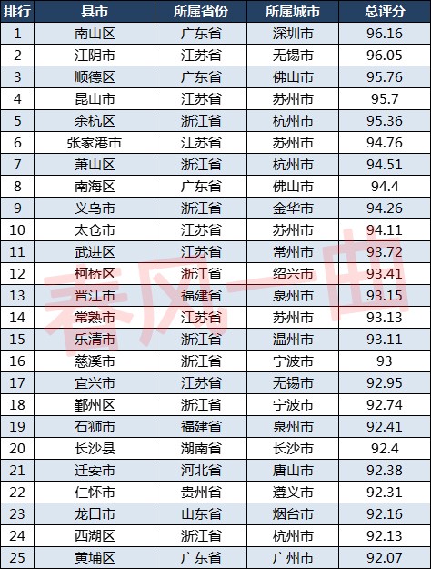 值得注意的是,十强县区从城市分布来看,有3个来自苏州,2个来自杭州,2个来自佛山,深圳、无锡、金华各有1个。苏州真的是想低调都没法低调,佛山则展示了一下肌肉和实力,虽然相对比较低调,但是实力还是杠杠滴。义乌市能够排名前十,或许经济层面略有欠缺,但也正好说明了榜单并非唯经济论,作为小商品之都,义乌市的综合实力毋庸置疑。