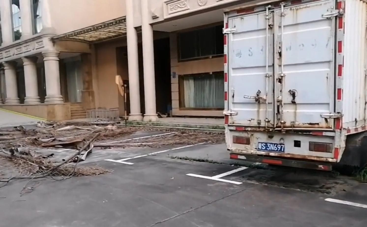 太子酒店的大门口,地上遍布着各类垃圾。已经是无人打理。和几年前相比给人一种巨大的落差,而停在一旁的大货车,早已经是锈迹斑斑。