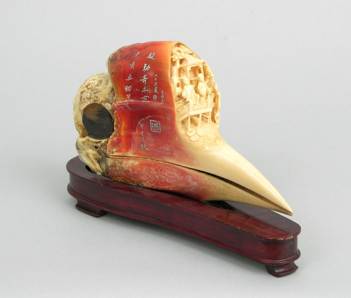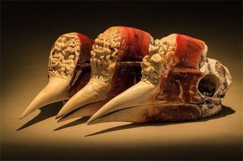 别的鸟头骨是中空结构,而犀鸟的头骨则是实心,它们在求偶时,会用头槌去锤对方,以征得交配权,正是这个因素,才引来了杀身之祸,盔犀鸟的脂腺,能产生血红色的物质,使原本黄色的盔突泛红,这也被称为“鹤顶红”,色泽红润的头骨,搭配上精美的雕刻,使之成为了文玩届的瑰宝