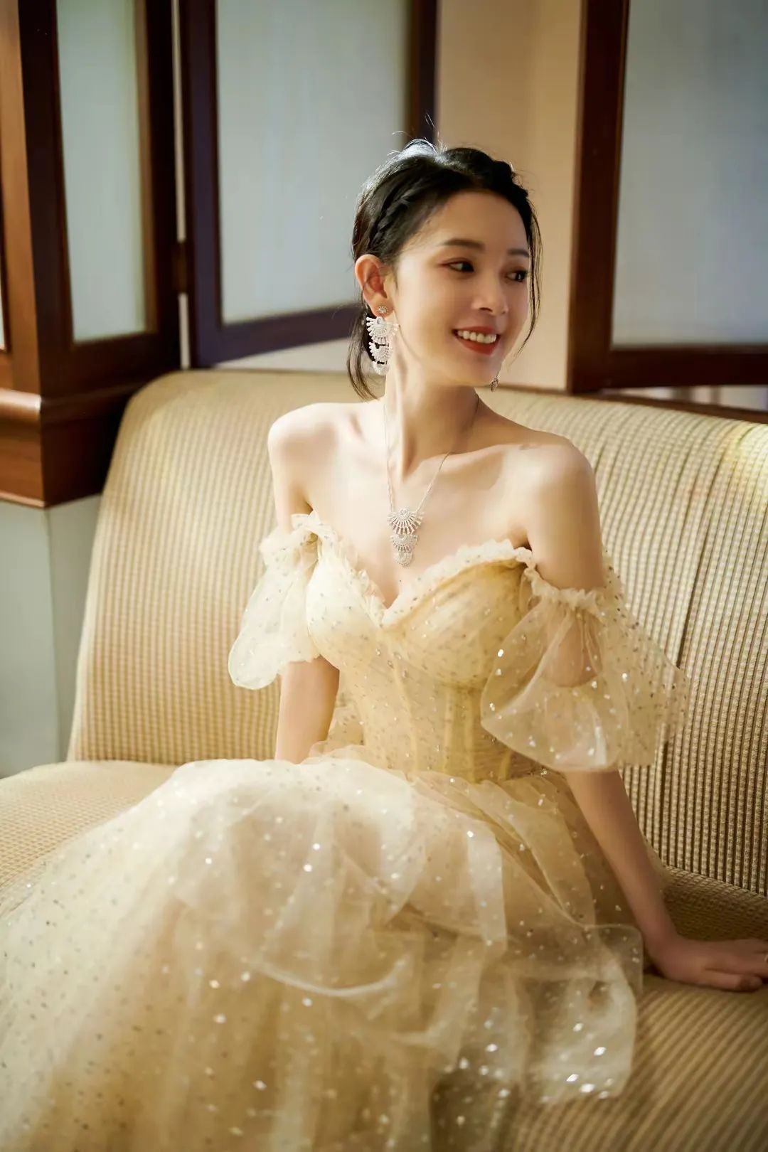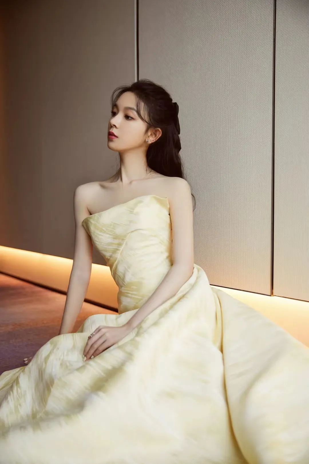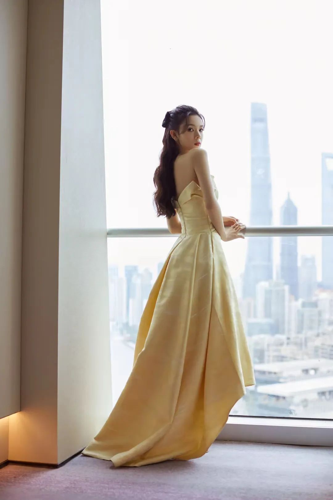 在光影交错的瞬间,陈瑶以一袭金色礼服,仿佛从梦境中走出,瞬间抓住了我们的目光。