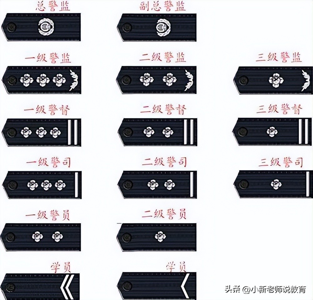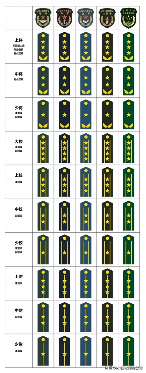 公安警衔是另一套体系,武警的“警衔”与解放军完全一致。解放军各军种和武警部队,肩章底板颜色不一样,用以区分。