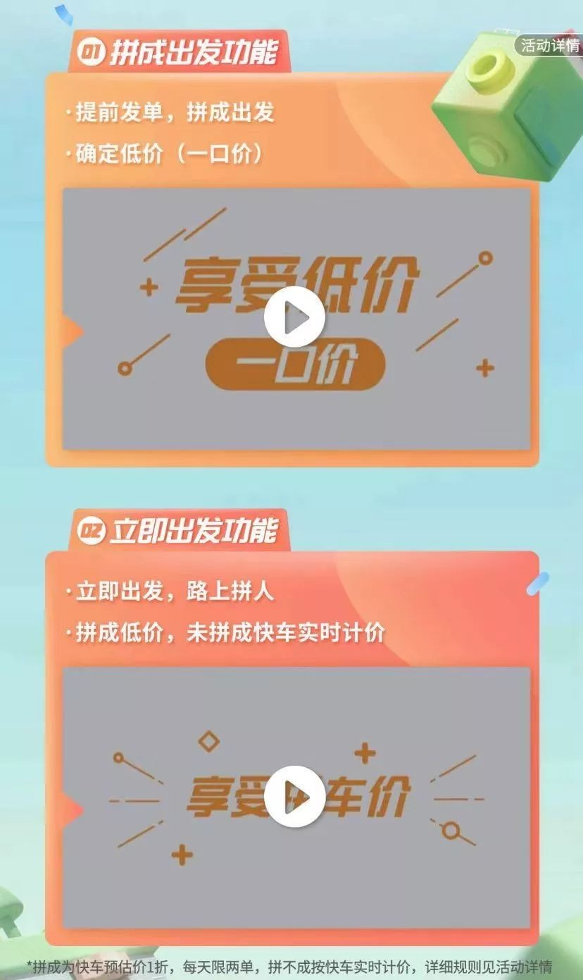 “拼成出发”功能则让用户在出发时,就能满足一口价乘车的需求。用户可在拼车独立页面提前发单,系统将先匹配拼友再叫车。提前下单便于系统积攒一定数量的拼车需求,从而提高拼成概率和顺路程度。