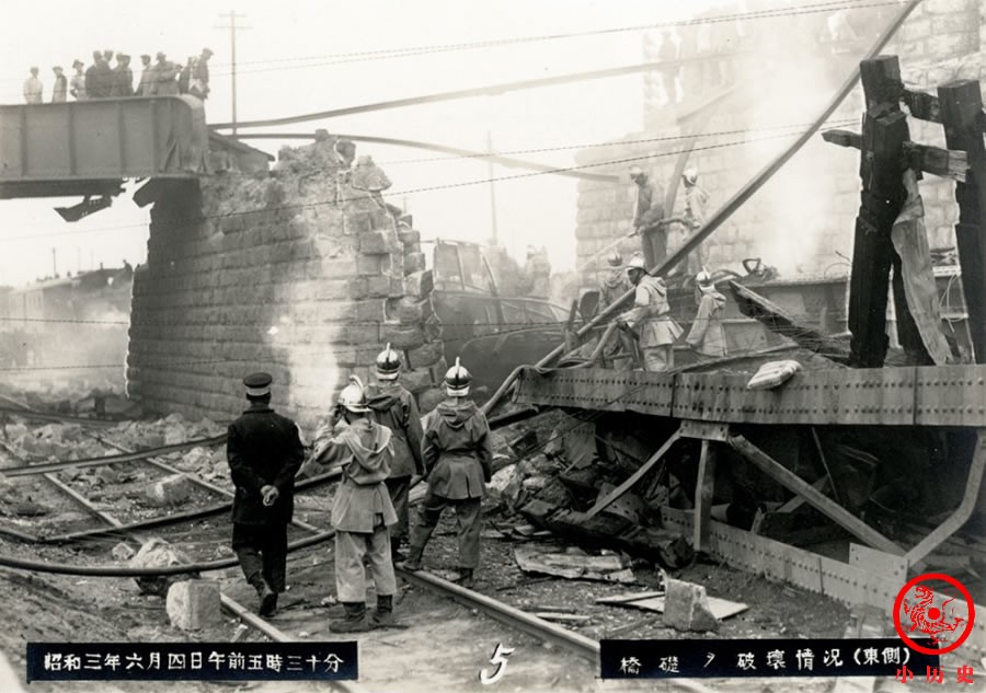 据当时记者在现场目击及采访得知:“桥下之路完整如常,而南满路之桥及轨道均炸去。由此可知,炸弹为预设于南满路之桥轨中者。在张车未到前十分钟,有二三十日兵,往来蹀蹀其间,车至,则日兵亦不见矣。被炸时间,在上午五时五十分(时间不准确,应为五时二十三分),车计五十辆,被毁乃在中段。炸弹之炸力极猛烈,遥见黑烟甚高,约百丈外,与地雷爆发无异。”