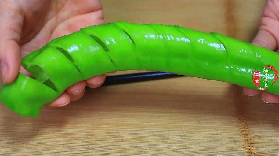 第二步、找一个筷子放在辣椒旁边,然后斜刀把辣椒均匀的切一下,垫上筷子不容易切断,造型也很漂亮。