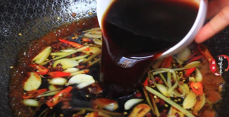 第五步、炒锅里面倒些油,油热后放入一把花椒炒出香味,然后再放入切好的配料煸炒出香味,倒入250毫升的生抽,200毫升的香醋,20克左右的白糖,一勺的蚝油,搅拌均匀后,大火把料汁煮开,煮上3分钟左右,然后关火放凉备用。