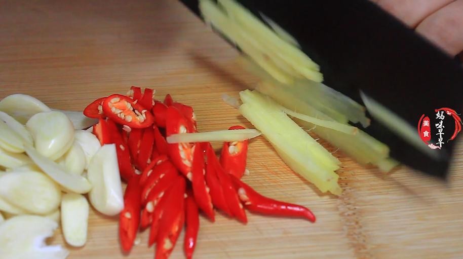 第四步、多准备一些大蒜,切成蒜片,小米椒斜刀切成圈,生姜切成细丝,全部切好后装碗备用。