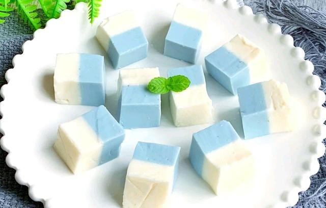 4.剩下的奶液加入蓝莓粉搅拌均匀,倒入冷藏成型的淡奶层果冻上面,放入冰箱冷藏两小时以上,凝固后切块。