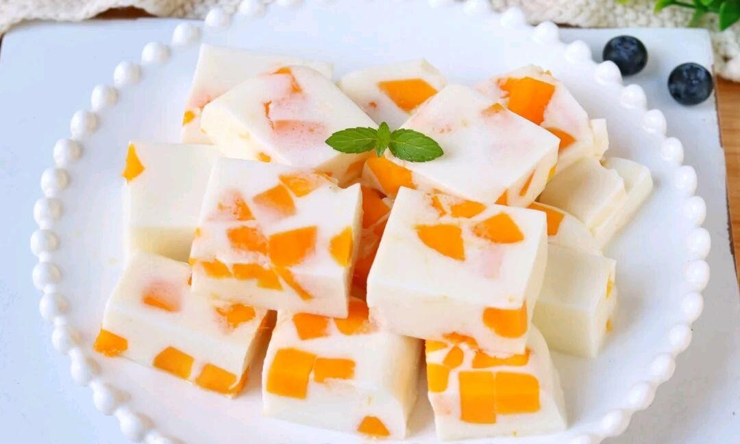 2.芒果切成丁,倒入玻璃碗中,倒入牛奶液搅拌均匀,放凉后放入冰箱冷藏几个小时。