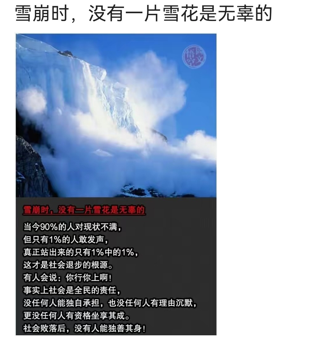 将流行于网络的、似是而非的陈词滥调略加梳理,不难发现莫过于“雪崩时,没有一片雪花是无辜的”这句所谓名言。
