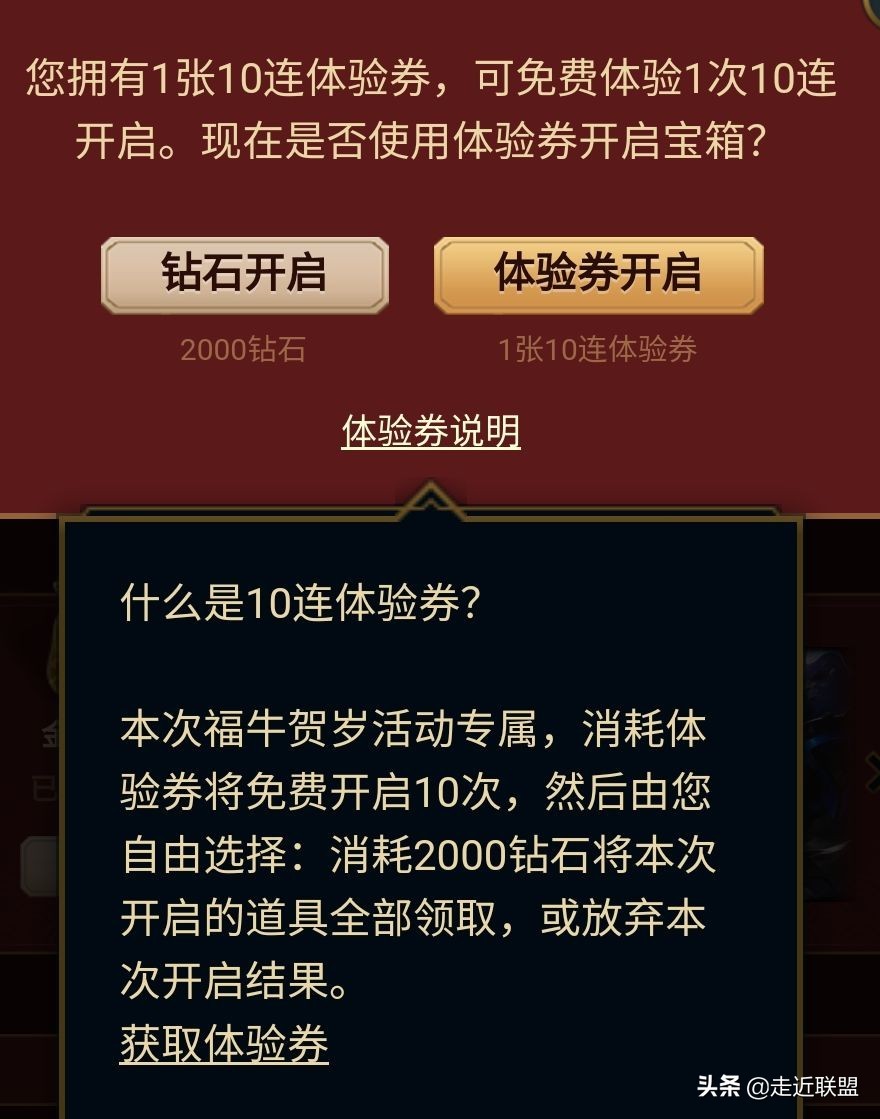 活动期间完成两个任务(任意对局和掌盟登录)可以获得一个图标和十连抽体验券,图标是小事,关键是这个十连抽体验券,大家知道十连抽需要2000钻石(200),对于很多玩家来说还是一笔很大的支出,想抽,但是又怕抽不到想要的皮肤。