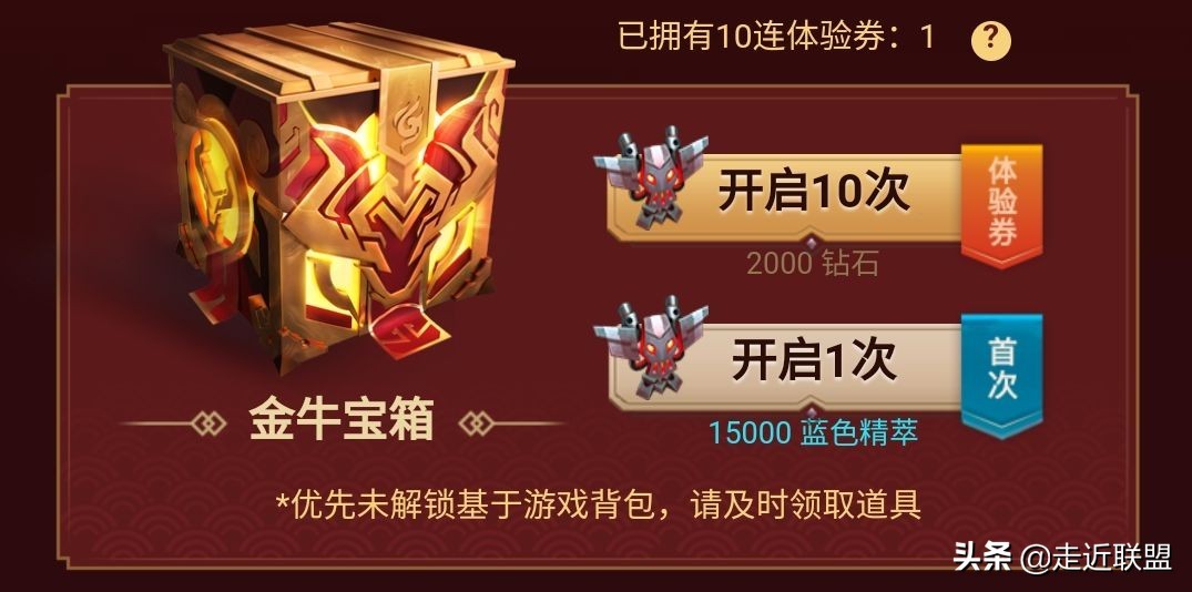 玩家可以选择开启一次或者十次金牛宝箱,十连抽会赠送一次抽奖机会。值得注意的是本次抽奖开启第一次时可以用15000蓝色精萃开启。