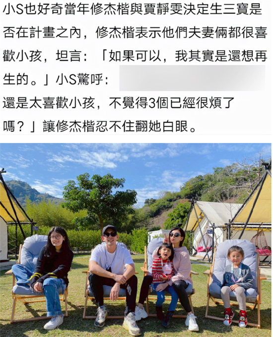 在节目中,修杰楷被问到当年与贾静雯决定生三宝,是否实在计划之内,他回复道自己和贾静雯都很喜欢小孩,之后,还坦言说“如果可以,他其实还想再要一个”。这个回答啊,直接惊到了小S,小S当场直呼“不觉得家里有三个小孩已经很烦了吗?”
