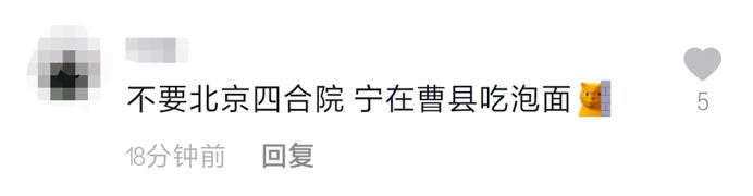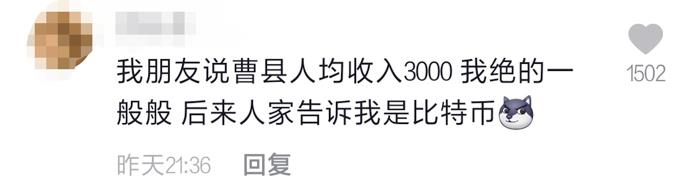 随后,众多视频创作者跟风模仿,各种社交媒体的创作者们也逐渐将创作重点转向了对曹县的调侃,网友们也加入其中。相关社交平台内容的评论区,也被调侃曹县的网友“攻陷”:“我朋友说曹县人均收入3000,我觉得一般般,后来人家告诉我是比特币”、“不要北京四合院,宁在曹县吃泡面”、“宁住曹县一张床,不要上海一套房”、、“山东丈母娘只认曹县女婿”、“我在曹县朗玛峰,有点曹县反应了”。