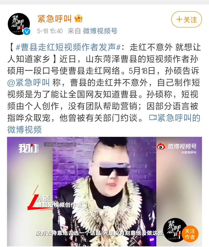 5月18日,据紧急呼叫报道,曹县走红短视频作者回应曹县走红称,曹县的走红并不意外,自己制作短视频是为了能让全国网友知道曹县,为家乡的发展做贡献。他称,短视频由个人创作,没有团队帮助营销;因部分语言被指哗众取宠,他曾被有关部门约谈,相关部门希望他多宣传正能量的事情。