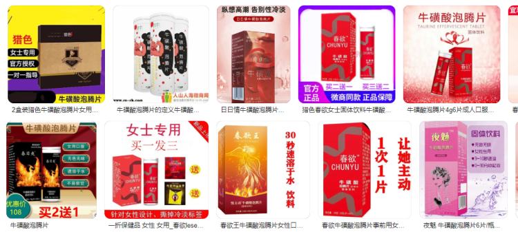在百度搜索“牛磺酸泡腾片+女用”,“春欲”“猎色”“夜魅”等词汇紧随其后,从文案到产品设计,都是成人用品的套路,妥妥的“催情药物”画风。