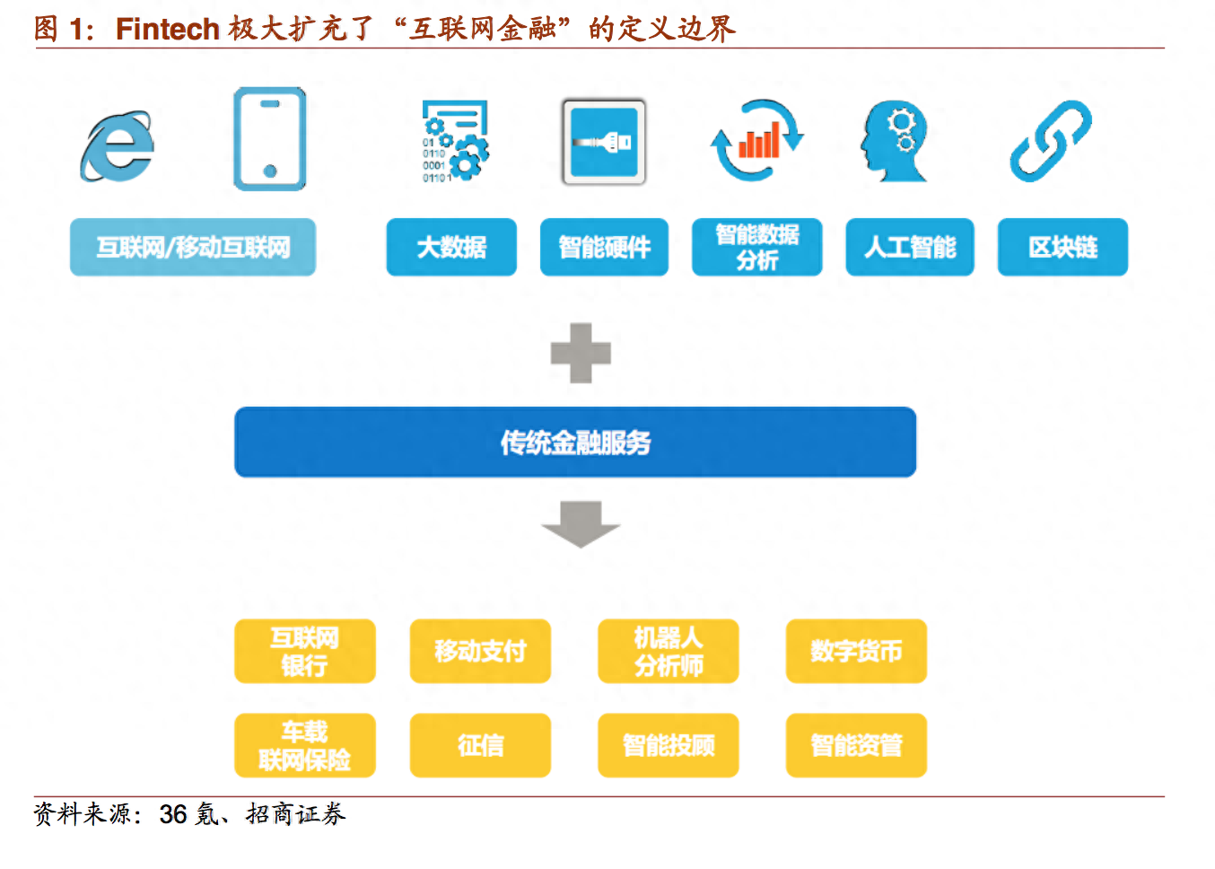 Fintech 极大扩充了“互联网金融”的定义边界:互联网金融是一个颇具“中国特色”的专有名词,主要借助互联网、移动互联网等手段对金融行业的商业模式进行优化,用户体验的提升伴随着金融业务运营成本的下降,所以互联网金融可以认为是 Fintech 的初级阶段。而 Fintech 作为全球性的产业趋势,其定义相较互联网金融则进行了大幅扩充,领域边界也在不断被刷新。大数据、人工智能、云计算和区块链的迅速渗透是其技术维度上的主要特征。