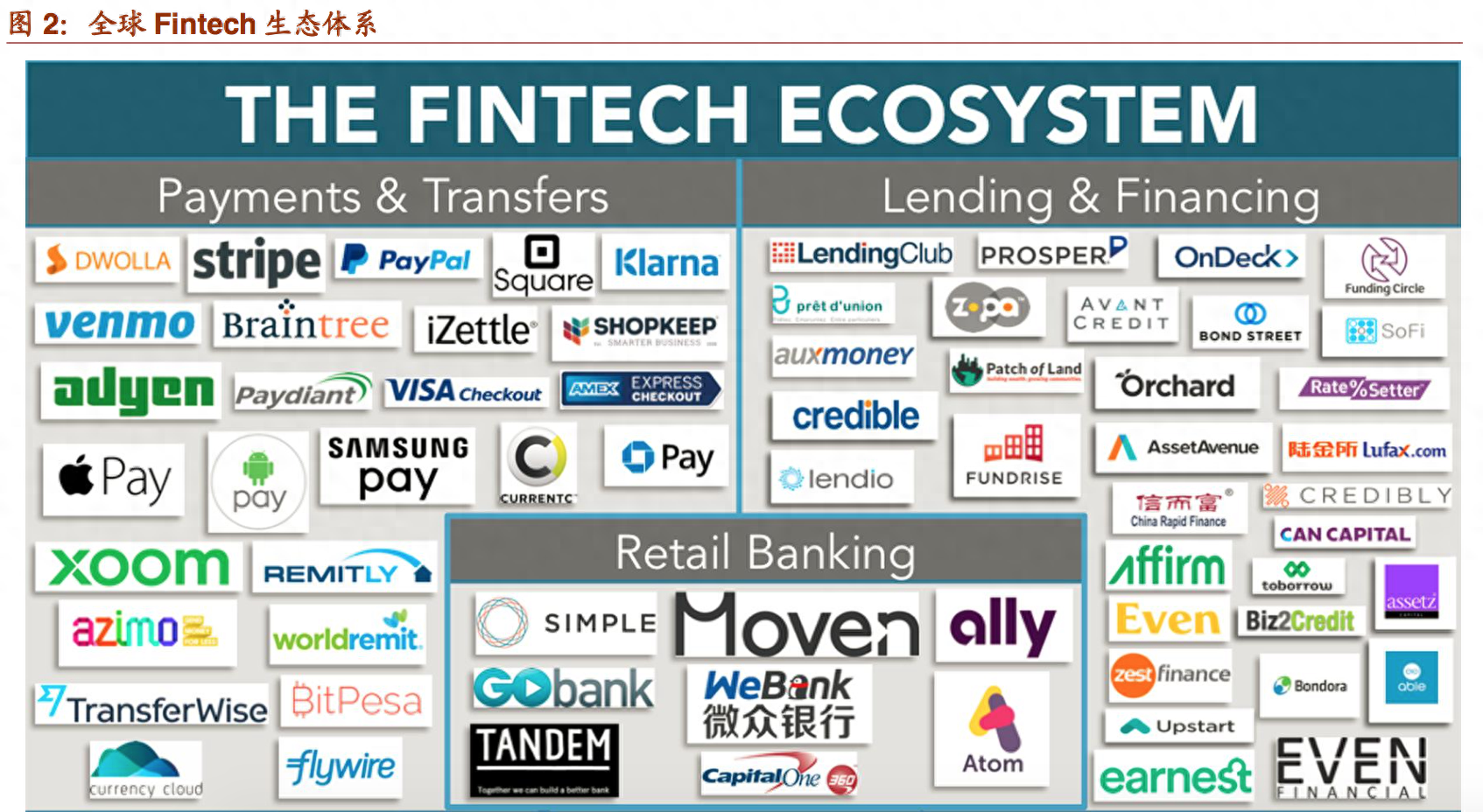 Fintech 在全球范围内的生态体系雏形显现:综合参考 BI Intelligence、KPCB、花旗等研究机构的分类模式,从细分领域的角度来看,目前全球 Fintech 生态体系主要分为智能财富管理、区块链、创新保险、移动银行、聚合支付、网络借贷、大数据征信等几大领域,各自业务层面上的边界较为明显。区块链、聚合支付、大数据征信等侧重于对金融服务基础设施的改造,提升效率并降低成本,或者对金融场景丰富度进行提升,以及对金融业务的覆盖对象进行扩充;而智能投顾、创新保险、移动银行、消费金融、网络借贷则是依托于“大智移云”等新兴技术进行的商业模式优化或创新。