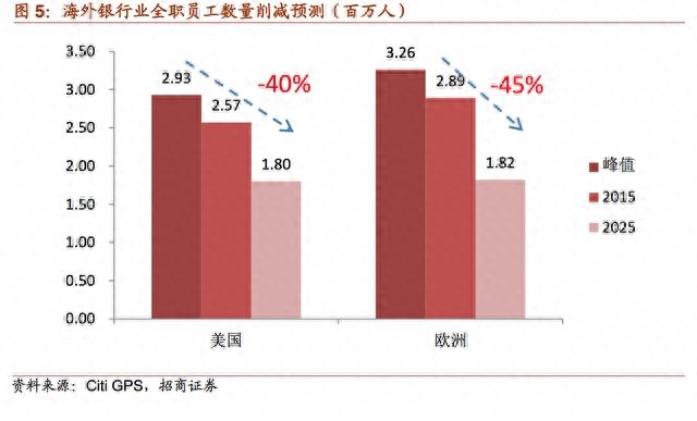 利率市场化等因素促使金融机构借助科技手段提升效率以削减运营成本:以银行为代表的我国传统金融机构在利率市场化的浪潮中面临巨大的盈利压力,削减成本并提高效率成为自然的选择。以银行为例,未来实体网店所扮演的角色将从目前的交易更多转向顾问和咨询等功能,之前绝大多数的人力工作可通过自动化手段来替代,员工数量削减的趋势有望进一步延续。参考花旗集团的粗略估计,到 2025 年,相较经济危机前的峰值水平将存在 40-45%的削减空间,从而降低 1750 亿美元的运营成本。