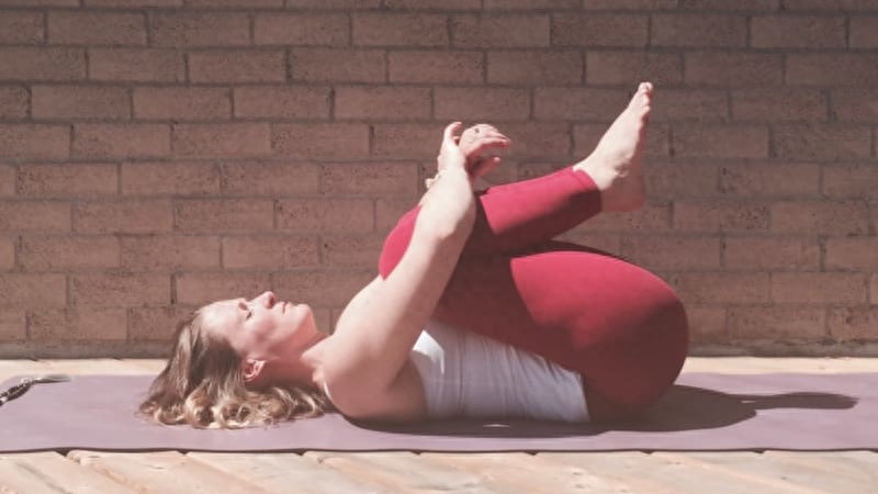 仰卧,将膝盖轻轻拉近胸部,握住小腿或大腿的背部。可以慢慢地左右摇摆。让你身体感觉良好即可。