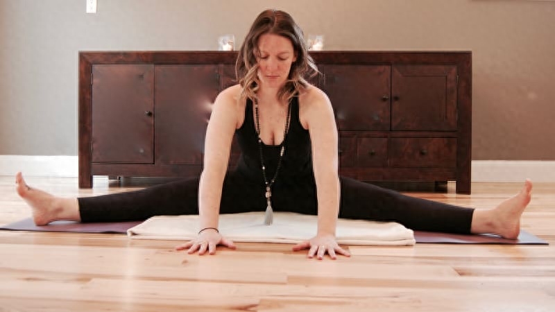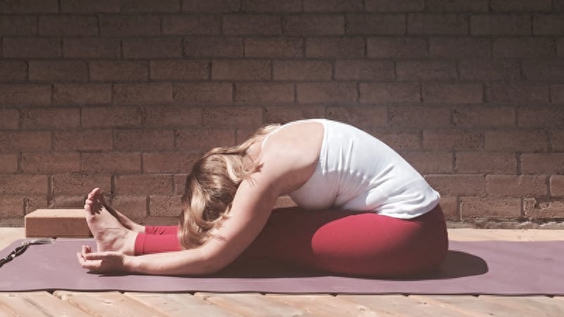 从坐姿开始,双腿向前伸直。开始向前屈,向前弯曲脊椎,放松双腿。您可以选择低头,以深深地拉伸上背部,肩膀和脖子。呼吸到身体的后部,特别注意心脏和肺部的正面,背面和侧面。保持30–40个呼吸。