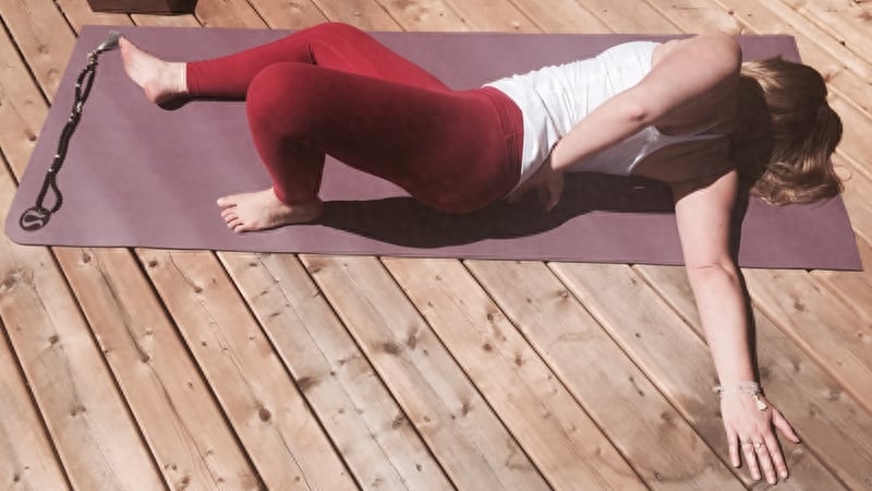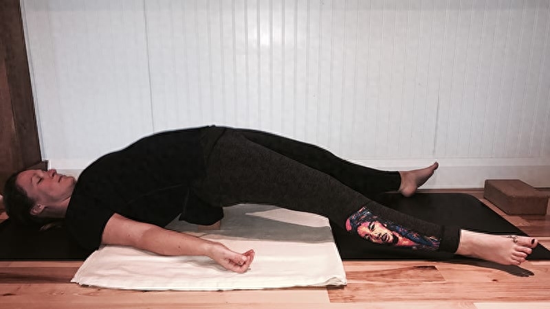 肩部和头部下方放上辅具,向后躺下,以确保肩膀和胸部打开并感到支撑。找到适合自己的手臂姿势,可以让手掌朝上。放松双腿,膝盖可以弯曲或伸直,保持可以让你放松的姿势即可。出来时,请下压肘部,并放下辅具向一侧放松。在起来之前,先在呼吸几次。