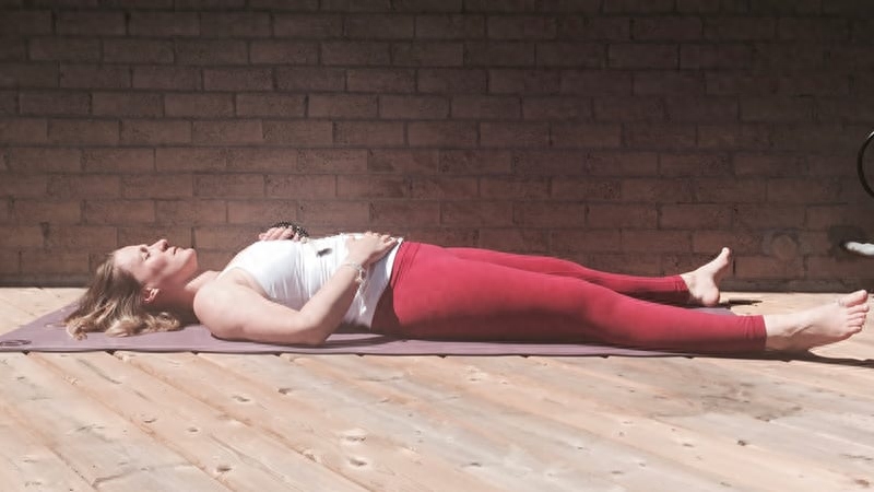 现在,没有任何期望或目的的躺下来。从这一姿势中释放出您练习后的紧张感和任何挥之不去的感觉。放松您的整个身体并安定您的思想。一只手放在心脏上,另一只手放在腹部上,让身体完全的放松。