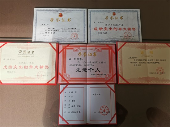 “军功章,有它的一半。”每当翻看着这些荣誉证书,张程就倍加怀念雪狼。在他心里,雪狼不仅仅只是他的搭档,更是他亲密无间的战友、知己。