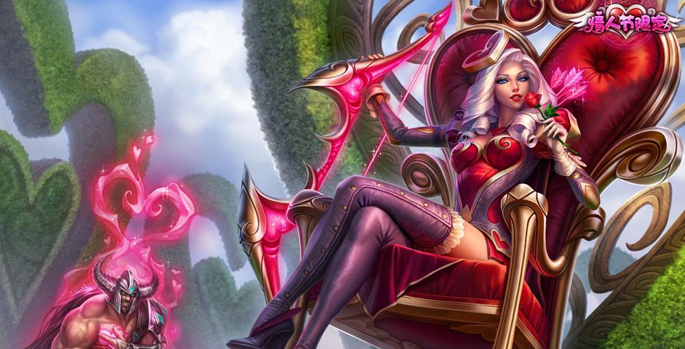 售价19900点券,情人节限定,原画里有一个彩蛋就是旁边蹲着胸口中了一个魔法箭的蛮王(舔狗到了最后应有尽有?),算是对俩人关系的一个正式说明吧。这款全特效皮肤的原画挺别致的,但是进入游戏画面之后你就会发现寒冰的眉毛完全变成了白色,看上去有些怪怪的。这个皮肤的E技能是一直鸽子叼着玫瑰花,大招也是很有少女心的粉色心形,命中之后炸裂效果非常好看,回城动作是女王坐在王座上嗅玫瑰花,可以说霸气十足了。