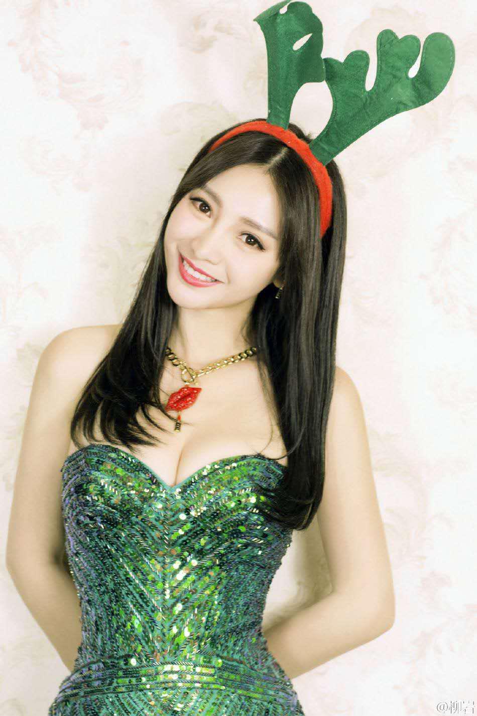 这一张照片中的柳岩穿搭可是非常可爱的哟。照片中,柳岩戴着一个绿色鹿角的发带,穿着一条亮绿色的裹胸长裙,裹胸的领口有些底,这样把她的胸都挤出来了,让人感觉她的胸特别丰满,而且她这一身可爱的装扮搭配上她甜美的笑容,真是让男人们“欲罢不能”。