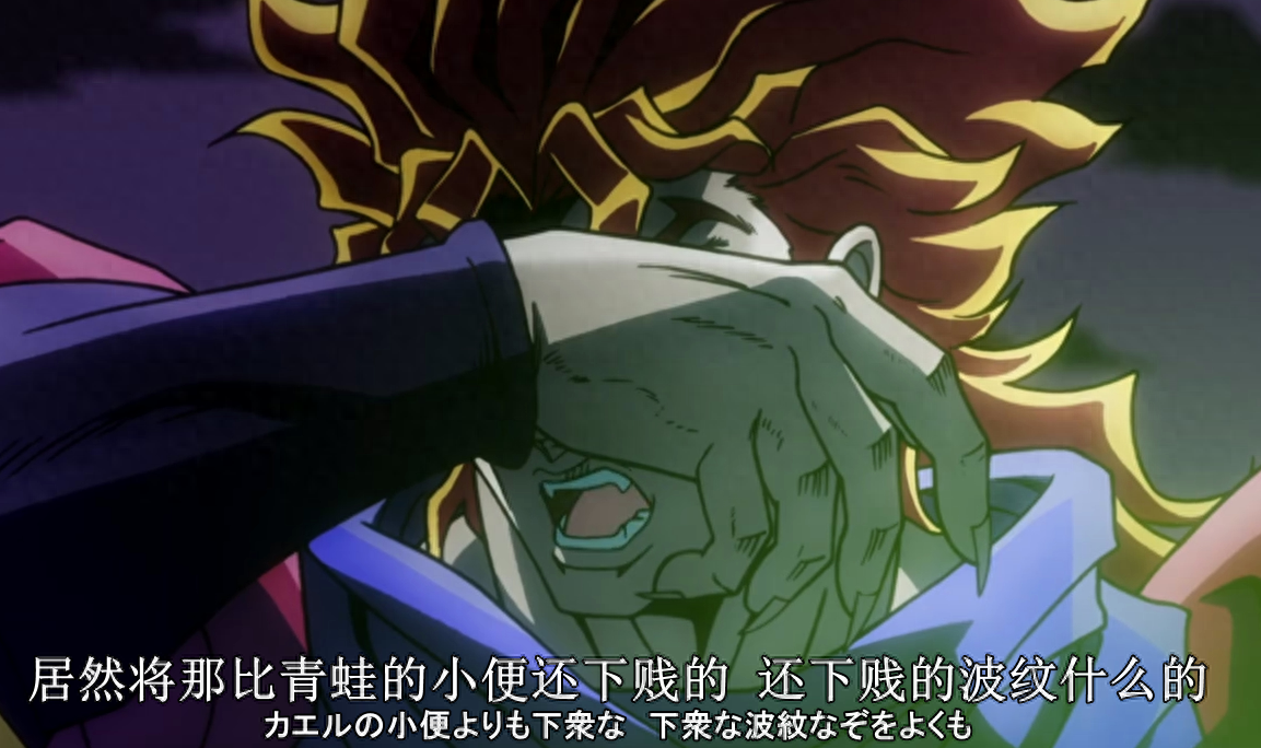 这个比喻出自第一部之中,作为波纹使的戴亚将波纹注入玫瑰划伤了DIO的脸,DIO在愤怒之下做出了此比喻。青蛙的小便可真是一般常人所想不到的,不愧是荒木老师,不愧是JOJO的奇妙比喻。