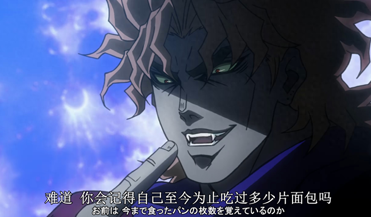 这句台词同样处于第一部,可以说是第一部之中最为出名的JOJO的奇妙比喻了。这是齐贝林在问DIO到底吸了多少的人血之后,DIO所作出的回答。可以说是在JOJO之中难得奇妙度贴切度都满分的比喻。当然这句比喻也在后来衍生不少梗,比如在DIO的眼中,大乔的子孙三乔就是个小面包。DIO:“你这小面包说话挺搞笑的。”