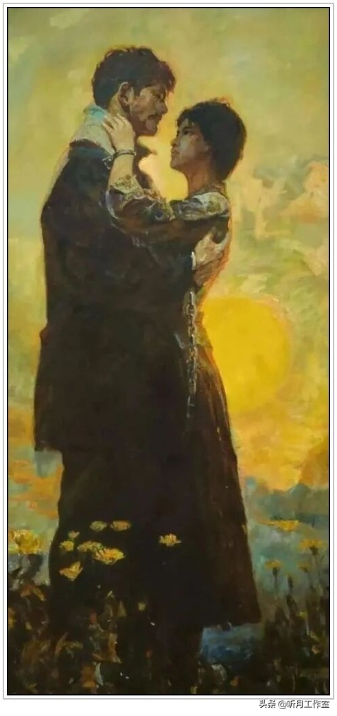 陈逸飞蔡江白 《只要主义真》1978年作,210×90cm,布面油画,夏明翰诗意图。此画整体画面采用了亮黄色做背景,突出使用色彩来表达人物的状态:即使身带铁链,神情依然从容。整体表达了画家对整个主题的终结致敬。