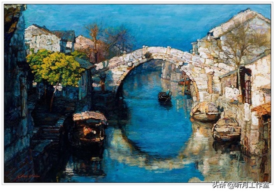 陈逸飞油画风景作品《周庄》画面以运河为中心,纵观画面意蕴悠长;水天一色,使观者感受到是非同寻常的宁静,使人神往,令人陶醉。