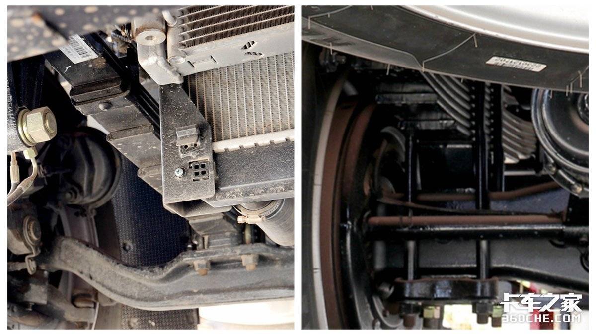 为了保障车辆的承载能力,在悬架方面,该车采用了前7片后7+3片的纵置钢板弹簧悬架。少片簧虽然可以减少车辆的震动冲击,但作为高强度运输且要具备良好承载能力的绿通车来说,选择多片簧更加合适。