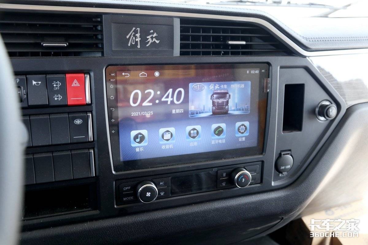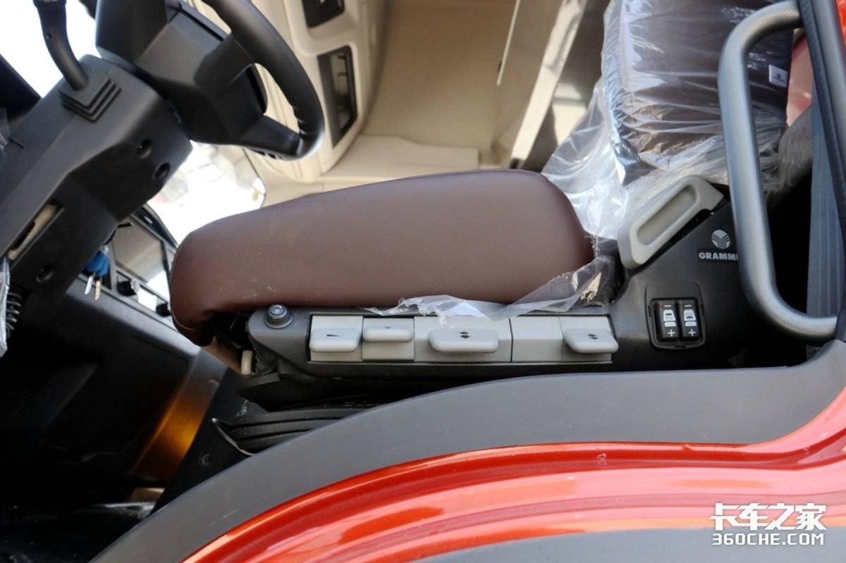 中控台上方还有软质材料覆盖,且有缝线工艺处理,结合副驾驶前方木纹饰板,车内质感营造非常到位。中控台将功能按键都集中在了左侧,方便驾驶员操纵,USB接口方便卡友给手机充电。中控台镶嵌的大屏尺寸达到了10英寸,支持货车导航、蓝牙电话、手机互联、语音控制等功能,丰富的影音娱乐功能让卡友们长时间驾车也不会觉得枯燥。
