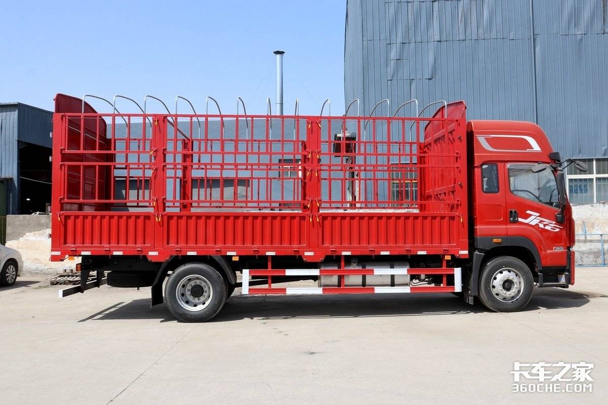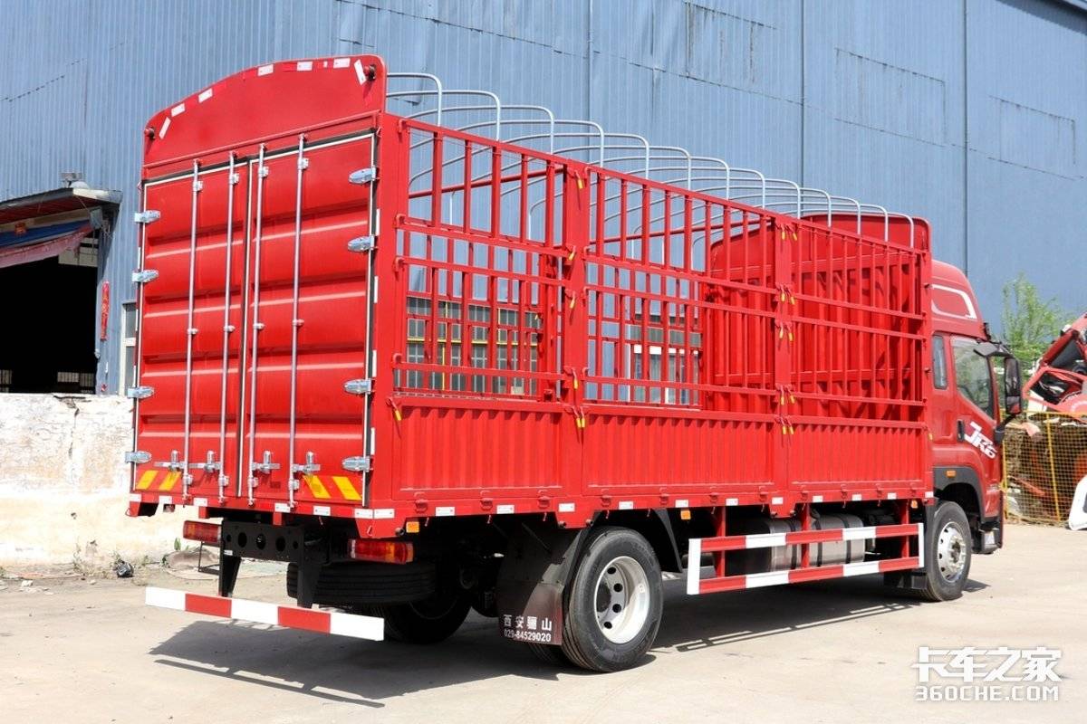 实拍的这辆JK6为车厢长度6.8米的4×2仓栅式货车,是绿通运输的理想车型。整车尺寸为9000×2550×3995mm,轴距5300mm。在货箱尺寸方面,这台JK6的货箱长为6.8米,货箱高度2.45米,货箱宽度2.45米,货箱容积约为40立方米。