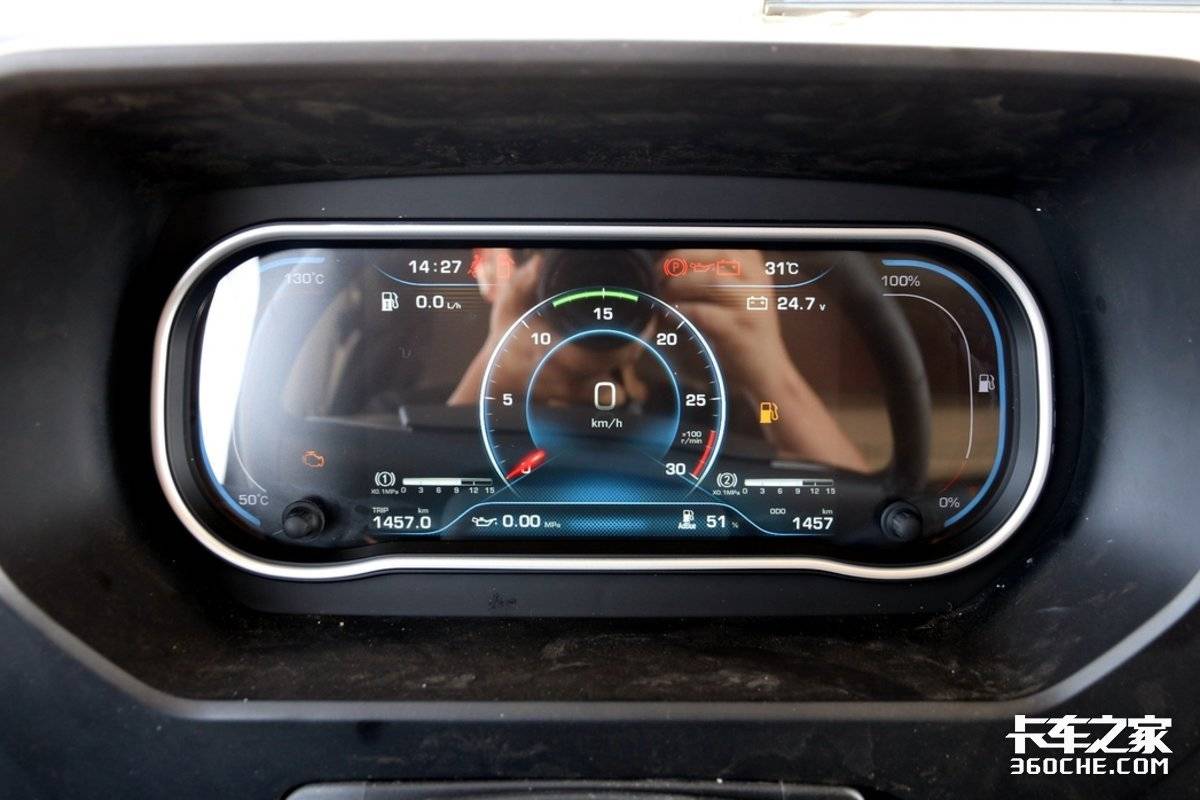 更让人惊喜的是,该车还配备了大尺寸的液晶显示屏,界面清晰且素雅,显示内容也非常丰富,像尿素容量、储气量、车辆保养信息、实时温度等都能展示出来。中间的时速表还将发动机的经济转速区间进行了高亮显示,方便卡友们时刻控制车辆的运行状态,以实现更佳的燃油经济性。