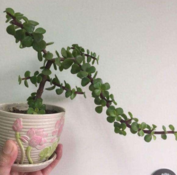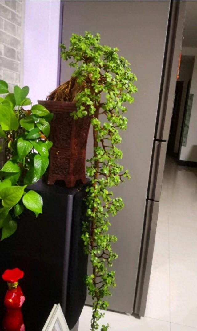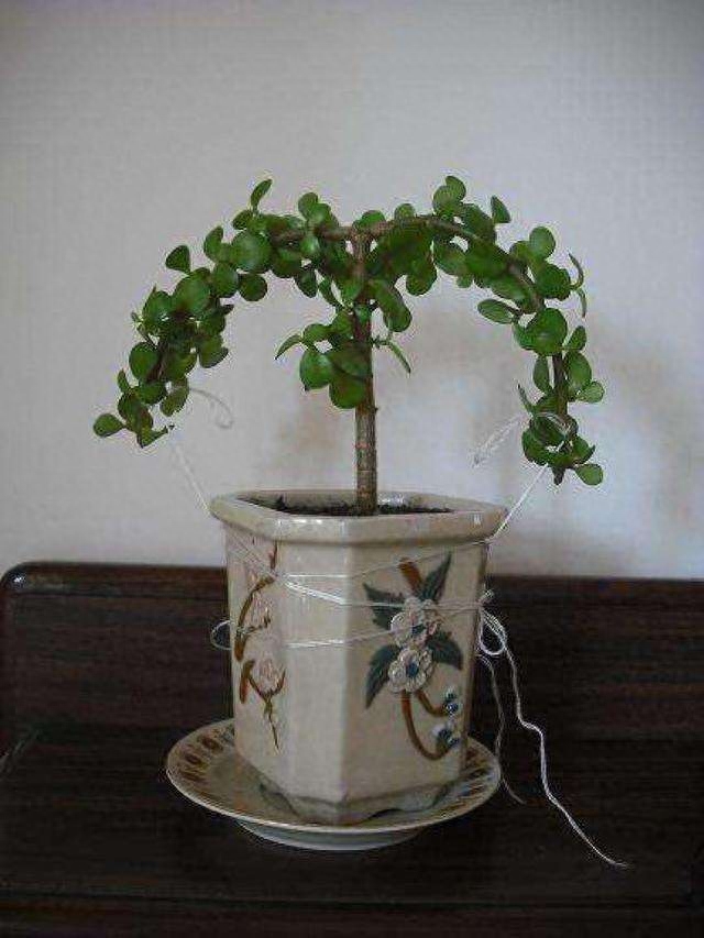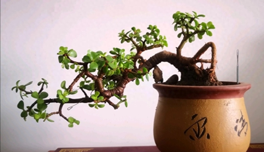 方式简单粗暴,不过不能操之过急,慢慢的一点点来,因为金枝玉叶肉质的茎秆比较脆,可能一下子就给掰断了。可以分几次来拉,每次拉一点点,等它定型了就可以撤掉绳子了。