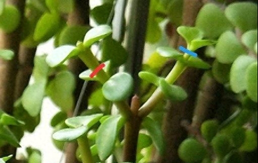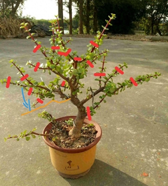 为了打造枝繁叶茂的盆景,修剪是必修课。如何剪?给个小小建议,如上图所示,这两个小侧枝的修剪部位应在红线和蓝线处。红线下的一对叶片是前后走向的,以后长出枝条也是一前一后;蓝线下的一对叶片是左右走向的,以后枝条就往左右两边长。这样就各个方向都有枝条,就匀称了。如果在蓝线下的一对叶片剪掉,也是留下前后走向的叶片,那以后就只有前后走向的枝条了,左右两边就会变得稀稀拉拉的,不好看。
