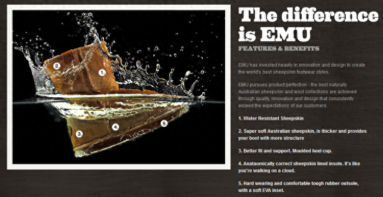 这个牌子也算是比较知名的了,号称全澳产(注:EMU是大部分Australiamade,也就是说成本一半以上来自澳洲人工/材料,在其网站目录里有小绿标三角的就是,可能另一半来自中国吧)。相对质优价廉,美国网站上也经常出现它的踪影,目前在很多国家已经有了分店(不包括中国)。可能是因为销量太大,所以EMU的鞋经常断货,导致消费者对它是又爱又恨。
