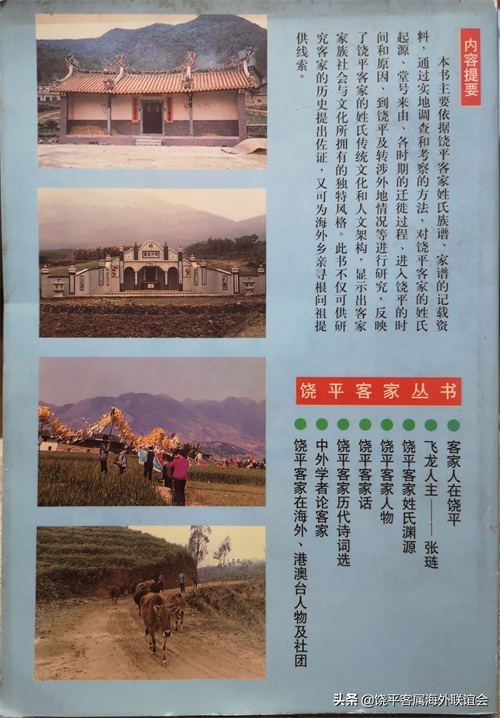 编者按,时隔二十多年后重新翻开“饶平客家丛书”系列书籍,为广东饶平客属海外联谊会前辈们的热心和奉献精神所折服,该丛书填补了饶平县域客家文化研究上的空白,开启了饶平县域客家文化研究的先河,丛书中表述的人文知识和透露的家乡情怀至今仍具很强的普教意义,是饶平客属后辈不能缺少的精神食粮!广东饶平海外客属联谊会第三届理事会秘书处近期将陆续整理饶北前辈的客家文化研究文献,今后将不定期发文推介一下饶平客家文化书籍,旨在宣扬客家先民的文化和精神,增强我辈之文化自信,也是对年轻一代进行热爱家园、热爱祖国的一种教育。