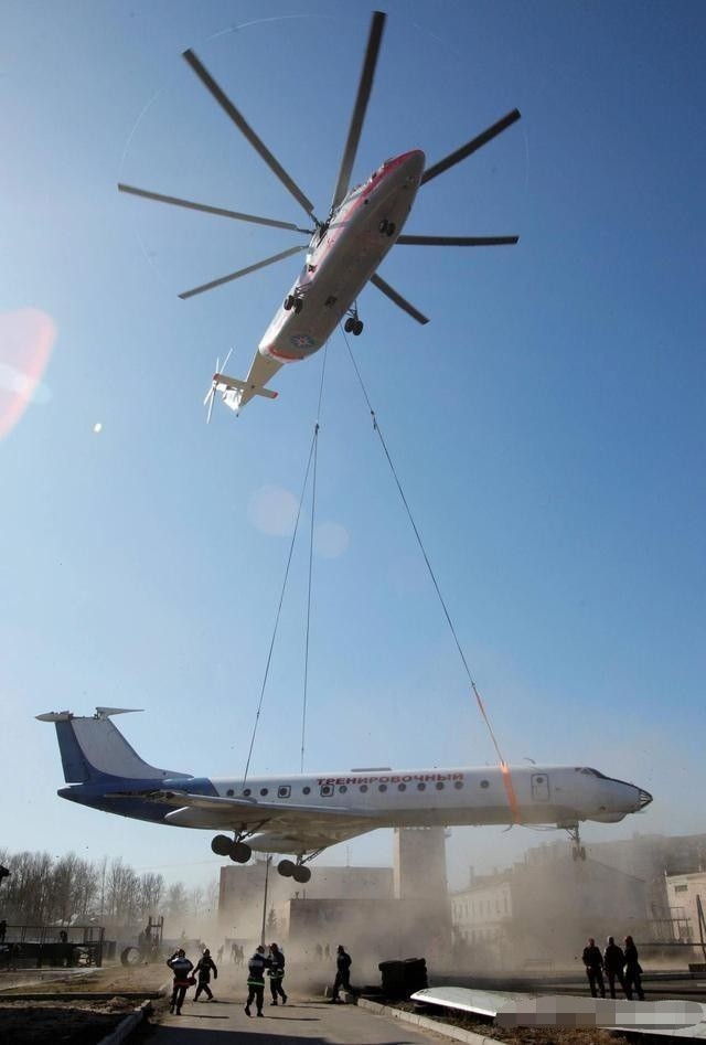 上图可不是P图,这是2012年俄罗斯运输1架报废的图-134客机至特种部队训练场用于解救人质训练的画面,这架报废的客机空重超过20吨(据说达到29吨),可还是被米26外挂吊运得服服帖帖。