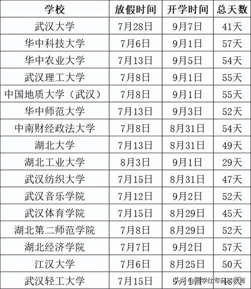 湖北部分高校2024年暑假放假时间