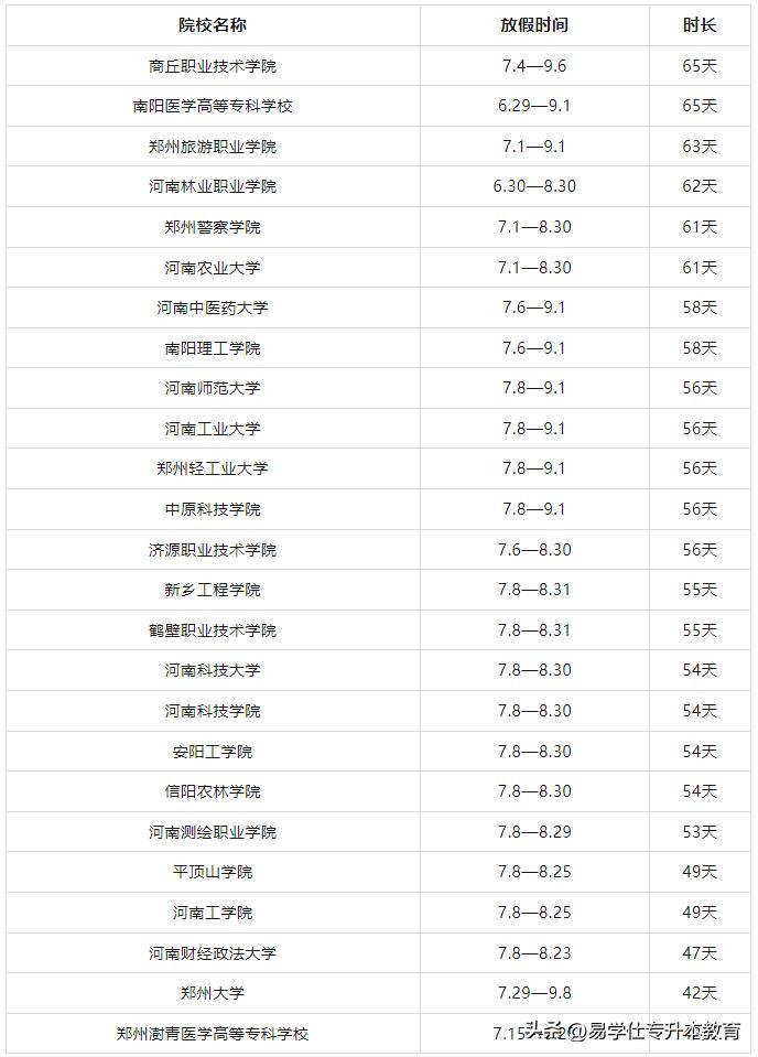河南部分高校2024年暑假放假时间