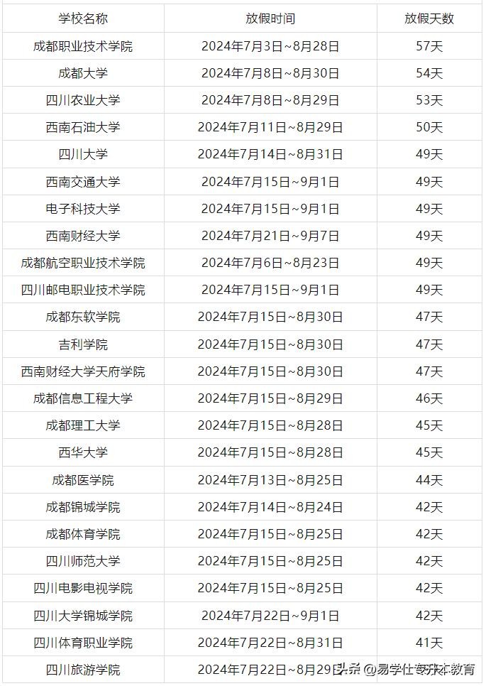 四川部分高校2024年暑假放假时间