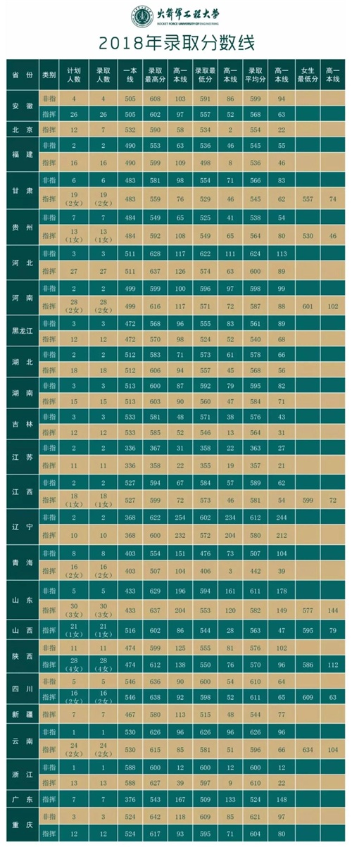 2020火箭军工程大学分数线多少分以及最近三年历年录取分数线是广大考生和家长朋友们十分关心的问题,以下是小编为大家整理的火箭军工程大学2017-2020年录取分数线信息,包含理科和文科,供大家参考: