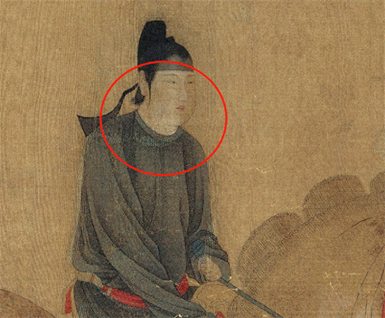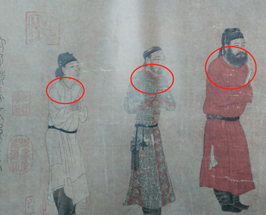 所有我们可以这里得出一条非常简单的经验:唐朝时期的圆领服饰,领口处不露衣服里面的交领中单;至少是从五代十国开始,圆领服饰里面就开始露出中单了。
