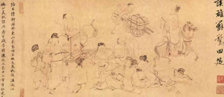 所以,这幅画肯定是宋朝以后的作品。那为什么我猜测可能是明清时期的绘画呢?这其实就是直觉了。我感觉很可能是明朝人画的可能性大一点,也许是临摹的唐宋时期的绘画,也许是自己的发挥。