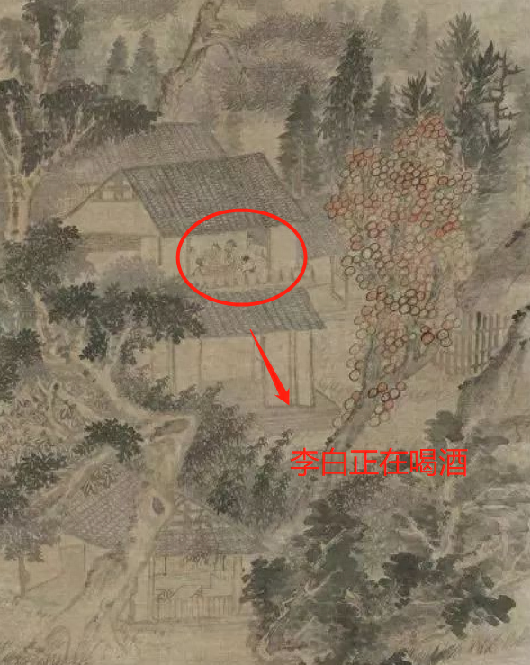 在这幅画里,我们依然能够远远地看到李白在喝酒。
