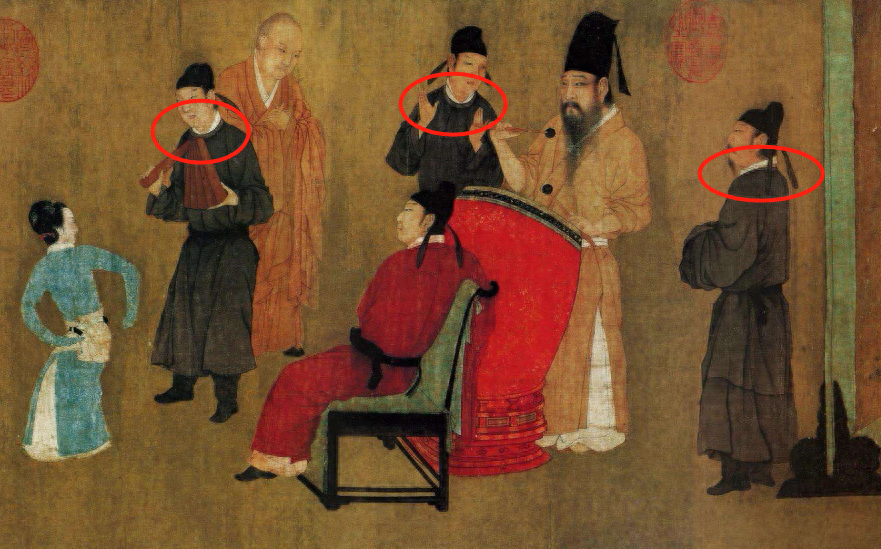 在这幅画中,所有穿着圆领长袍的人,他们的领口处都露出了里面的交领中单。这和我们现代人穿西装,露出里面的衬衫领子是非常相似的: